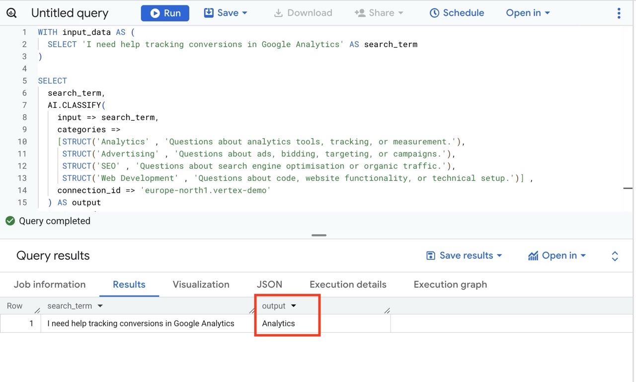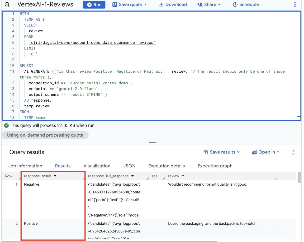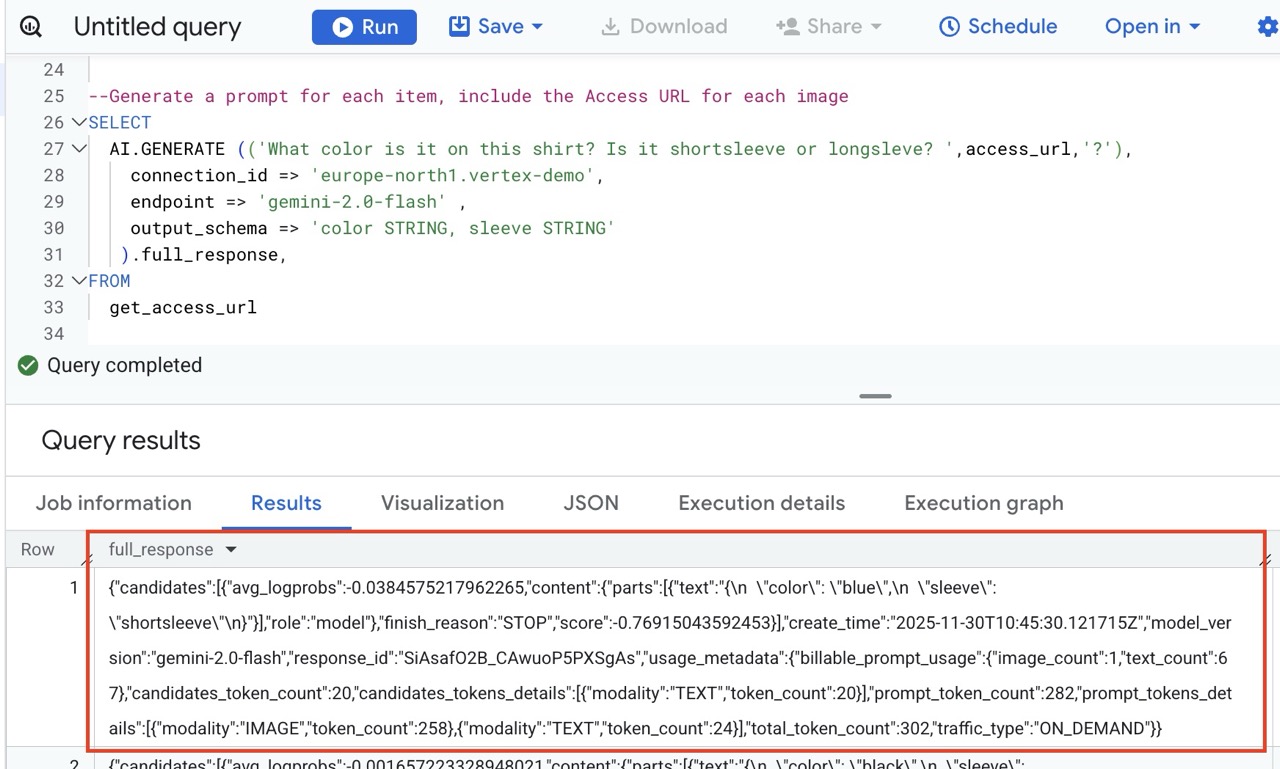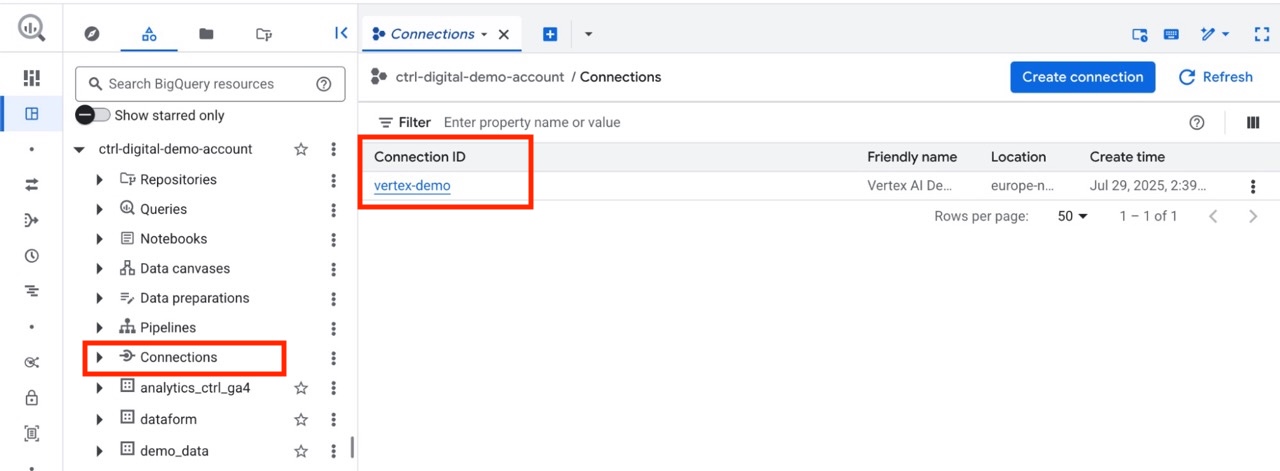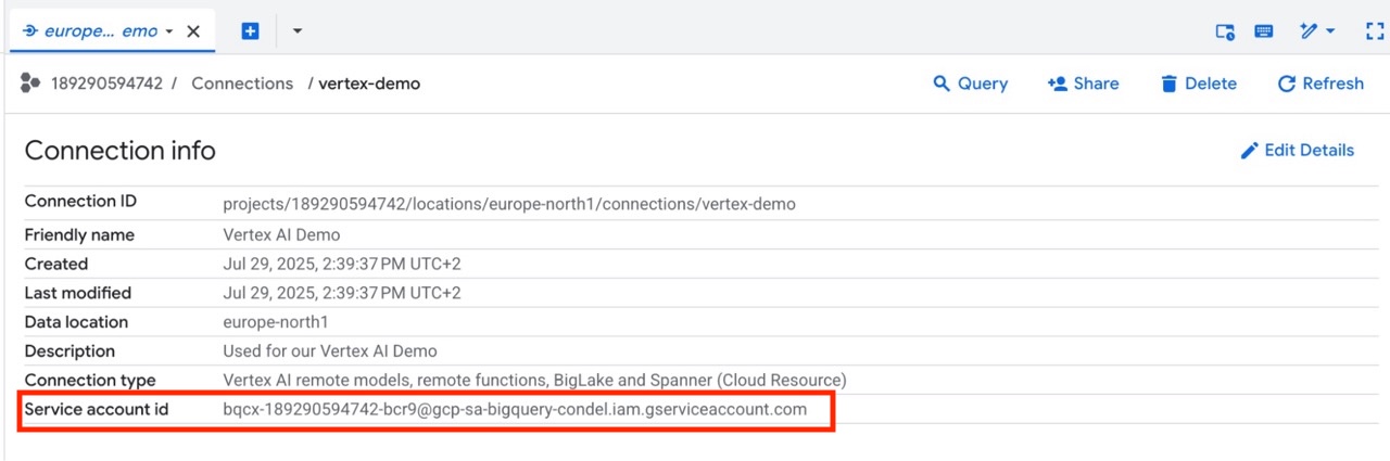 In the example above we use our connection, named vertex-demo, in the region europe-north1.