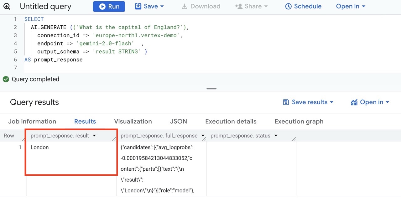 Lets look at one of the available functions, AI.GENERATE sends a prompt to an LLM model and returns a generated response. You can use it to summarize text, rewrite content, extract insights, or create structured output. AI.GENERATE is the most flexible of the AI functions.