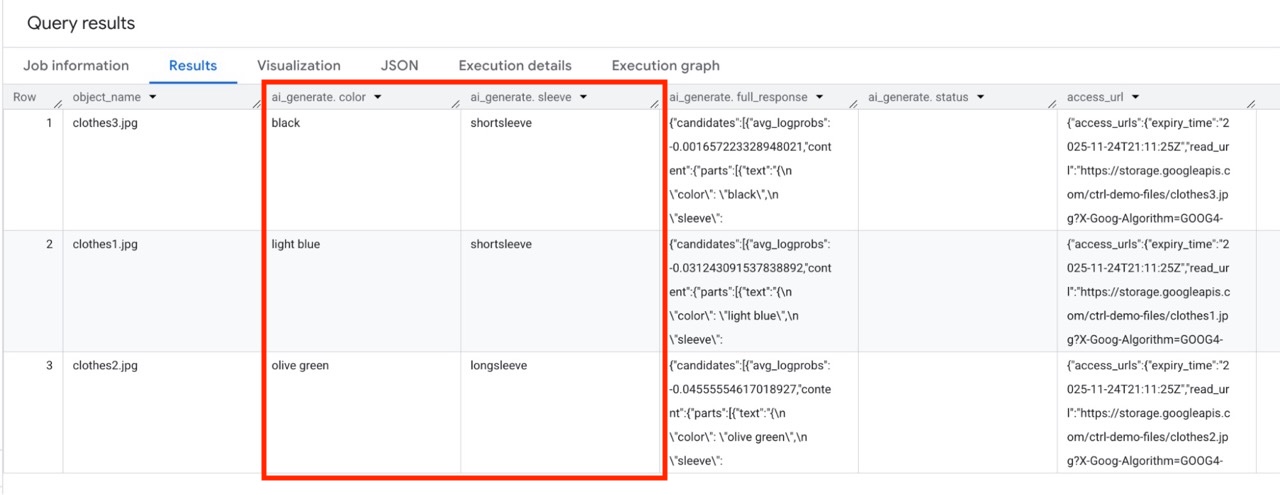 For the result we first display the object_name, and then the two prompt responses, color and sleeve.