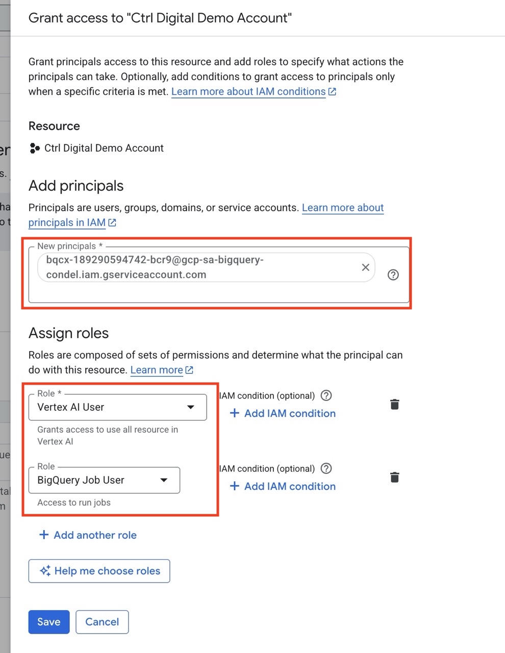 Select Vertex AI User and BigQuery Job User as new roles.