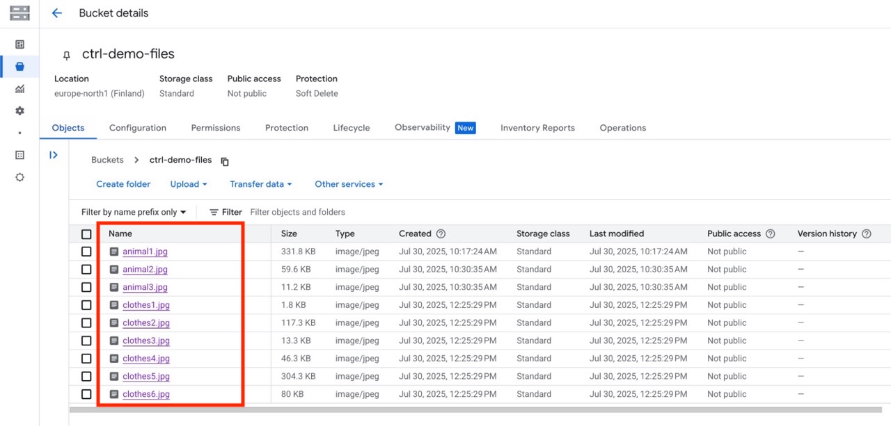 We start by creating a Google Cloud Storage bucket and name it ctrl-demo-files.