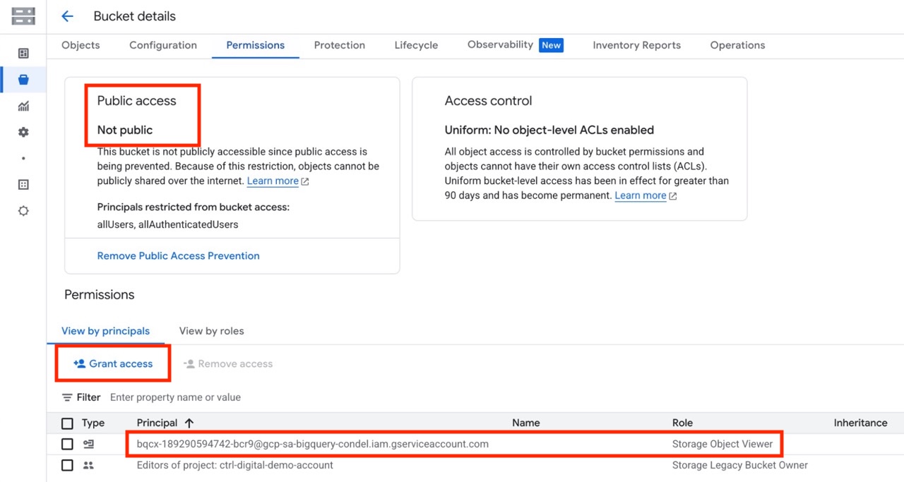In our storage bucket, under Permissions click Grant access, paste the Service Account ID we used earlier and give the permission Storage Object Viewer.