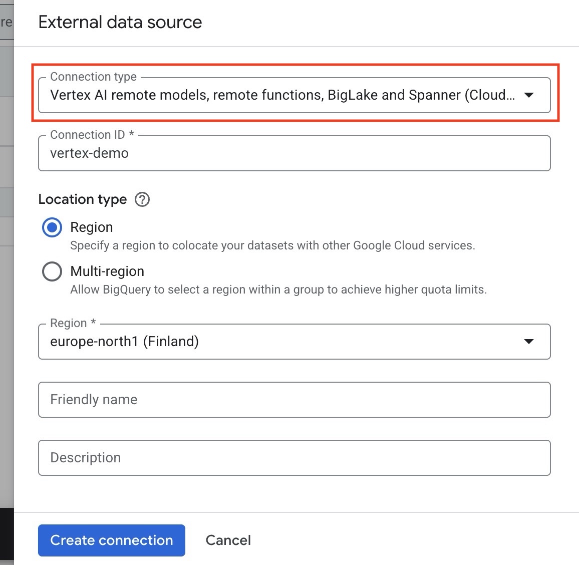 Under Connection type, choose Vertex AI remote models.