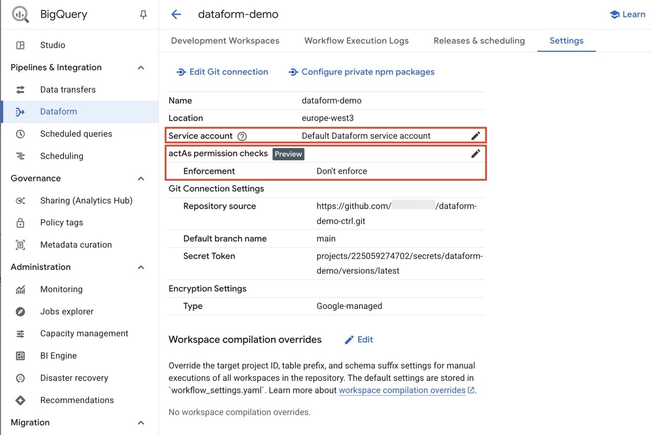 To prepare for Google’s upcoming actAs enforcement, make sure your Dataform repositories use a dedicated service account with the correct permissions and that all Git secrets in Secret Manager are properly configured. This setup ensures secure and reliable workflows once the new rules take effect in 2026.