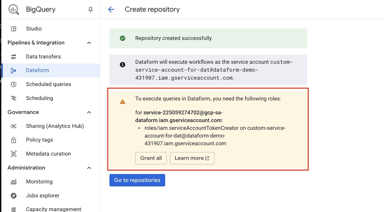 Try executing a workflow in Dataform using your new Service Account. It should run successfully and you are all set.