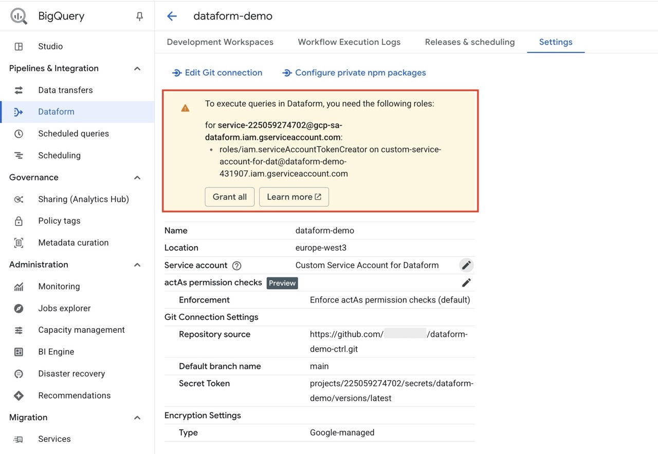 Give the new Service Account the necessary permissions to operate Dataform, BigQuery and access the secret tokens for GitHub.