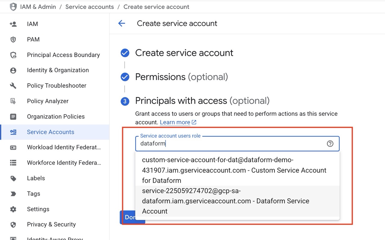 - Start by creating a new custom Service Account with the necessary permissions for Dataform, BigQuery, and Secret Manager.